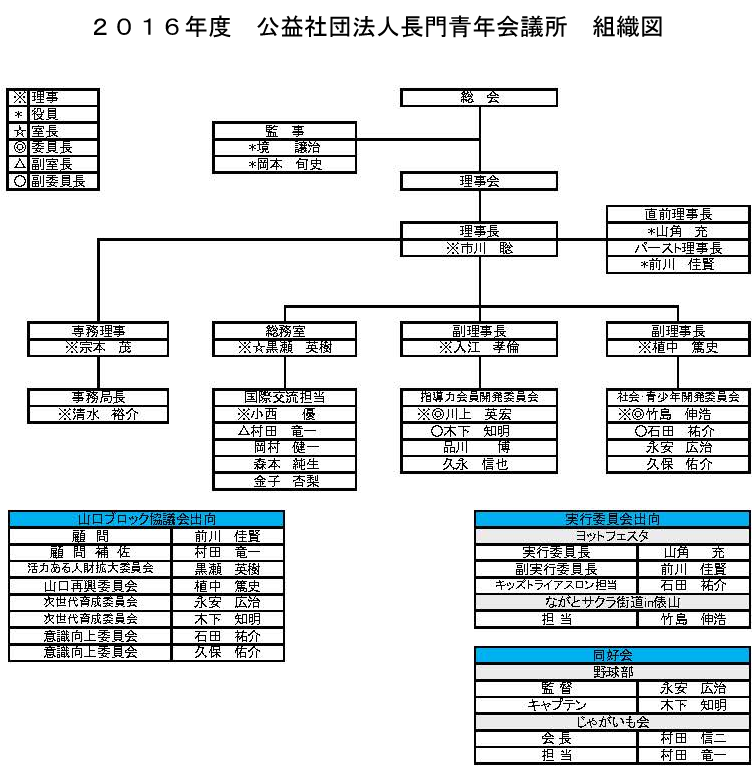 指導力会員開発委員会 委員長 川上 英宏 (長門中央薬局) 私たちは長門JCの伝統を絶やさず地域活性のリーダーとして存在感を発揮し、大きな使命感を持って運動を展開してきました。しかしながら、昨今、会員数の減少から組織力の低下が懸念されるようになっています。そしそのため、今年度の指導力会員開発委員会の事業目的と致しましては、各個人の資質の向上、また地域を見据え、我々と同じ志をもった仲間を増やすこと、つまりは組織力の強化としています。組織の根幹をより強固なものとすることで、長門の明るい豊かな未来に向けての大きな一歩となればと思います。至らない点が多々あるかと思いますが、何卒ご指導ご鞭撻の程よろしくお願い致します。