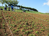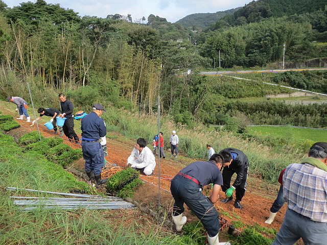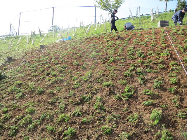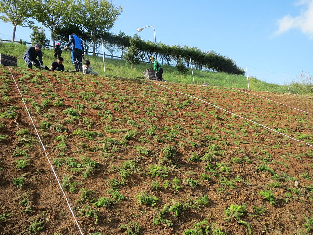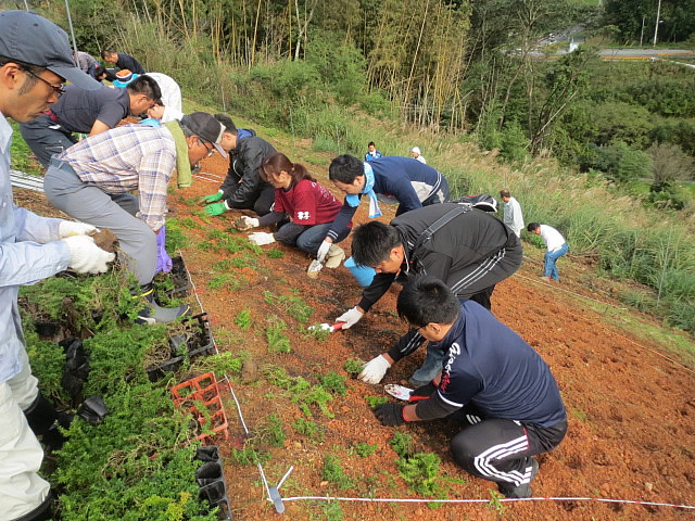 俵山スパスタジアム周辺法面に、1500株の芝桜の植栽を行ないました。植栽作業はこれまでも行なってきたのですが、植栽場所が急な法面であったり、鹿などの被害にあったりなどで、なかなか根付かないというのが現状です。今回の作業では、植える苗一つ一つに専用の穴を掘り、これまで以上に深い位置へ植え込みました。また、害獣対策として防護ネットの設置も行ないました。ご協力いただいた市役所の方々、大津緑洋高校日置キャンパスの先生方、建設業組合の方々、俵山の方々、JC OBの先輩方、この度も本当にありがとうございました。