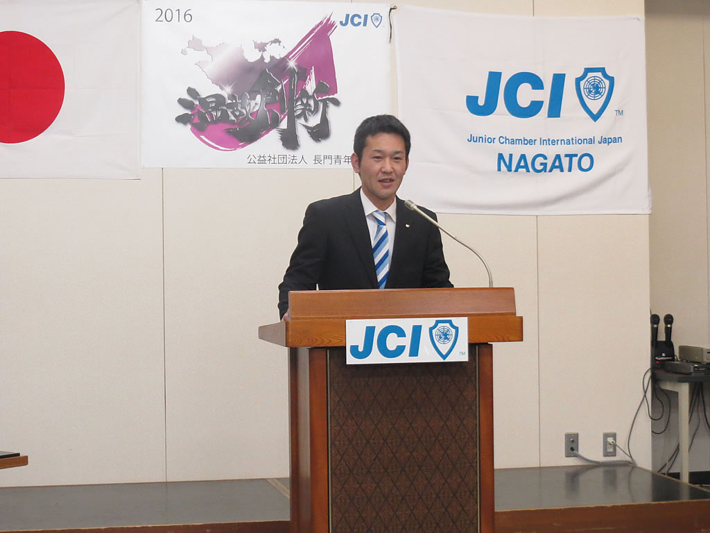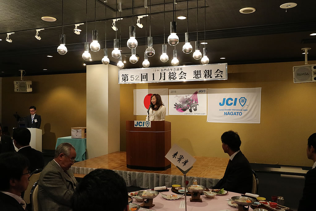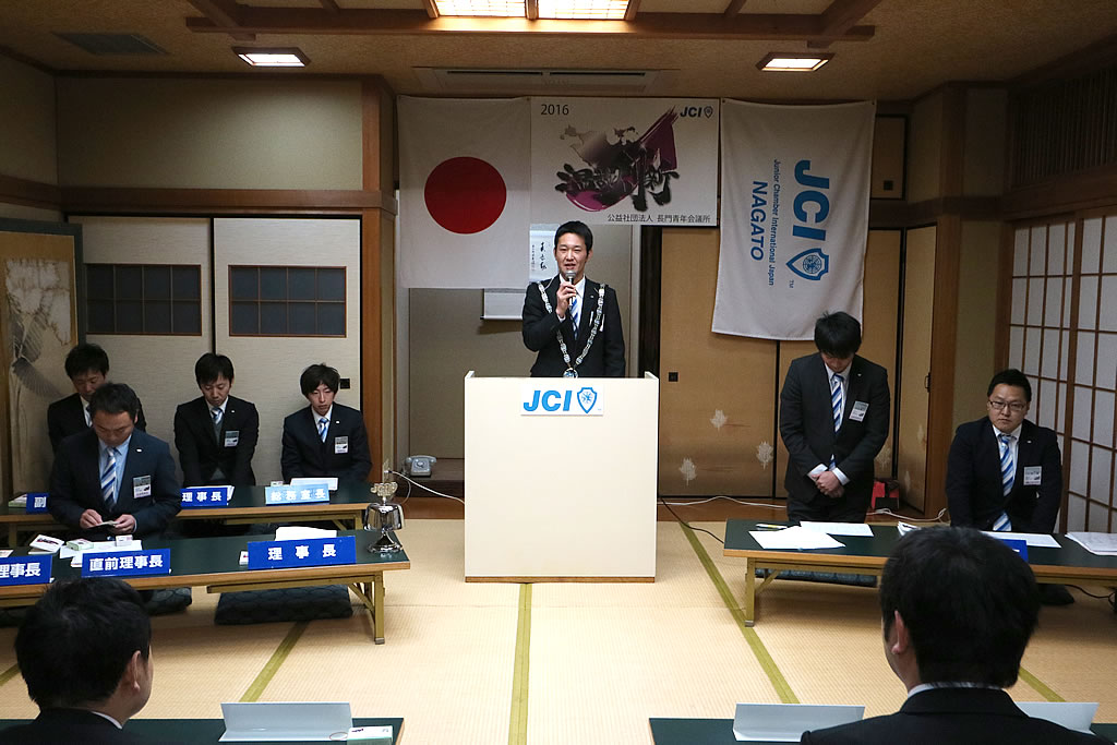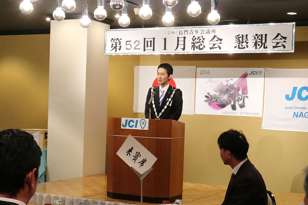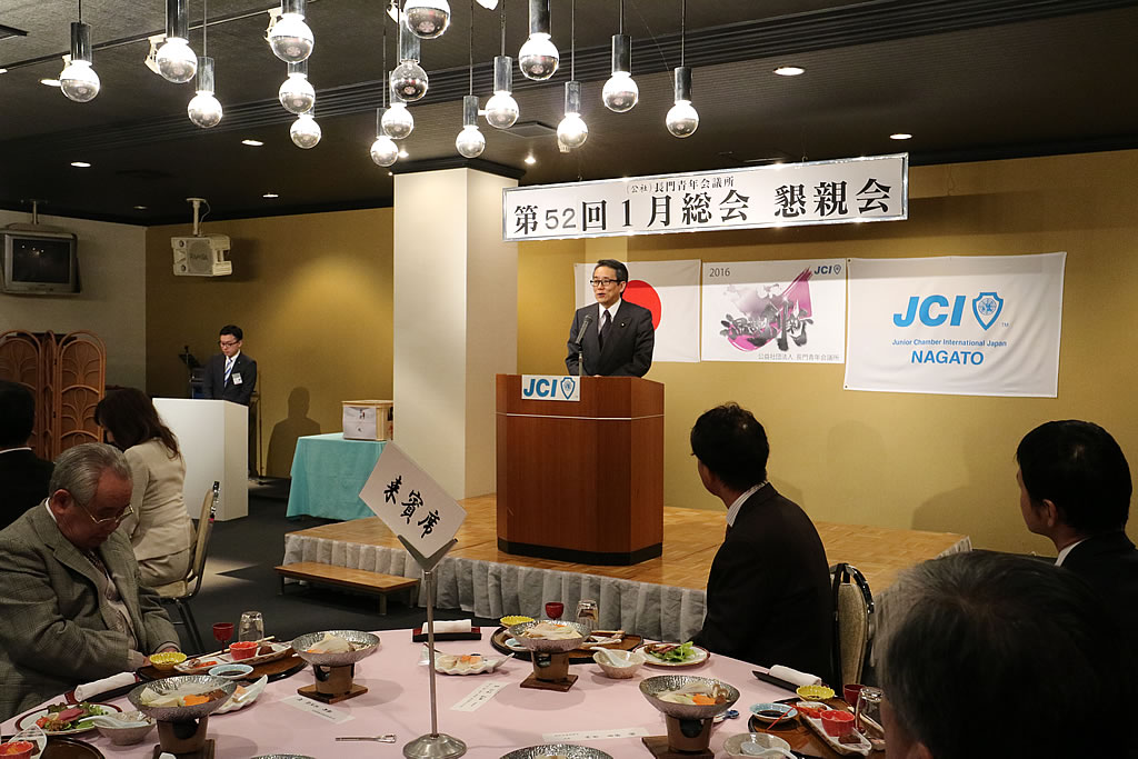 1月10日(日)、市川理事長率いる2016年度体制の初披露の場として、第52回定時総会・懇親会が大正館にて行われました。定時総会第1部では、2015年度の事業報告、会計報告、前年度理事長・山角充君の退任あいさつ及びプレジデンシャルリースの引き継ぎが行われました。第2部からは今年度の事業計画、事業予算が可決され、市川理事長のスローガン『温故創新』のもとメンバー一丸となって活動していくことを誓いました。懇親会では江島潔参議院議員をはじめ、林芳正参議院議員 令夫人裕子様、大西倉雄市長、笠本俊也県議会議員など多くの来賓の皆様、そしてOB会会長である西田和弘先輩をはじめとする長門青年会議所OB会の皆様などのご協力により、無事盛会に終えることができました。ご協力頂きました会員メンバーや関係者の皆さには深く感謝申し上げます。