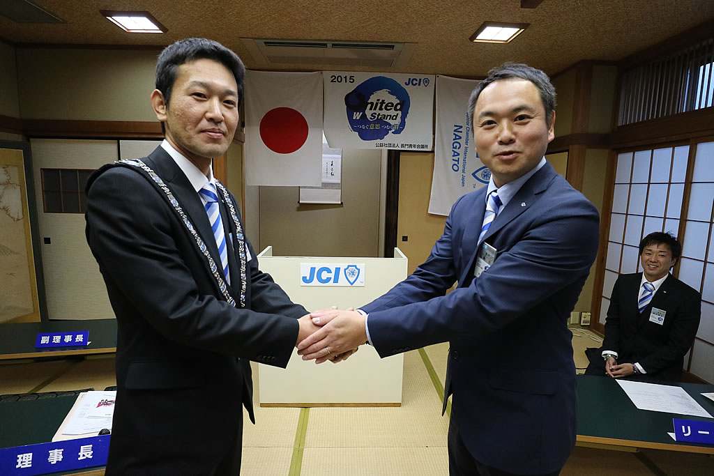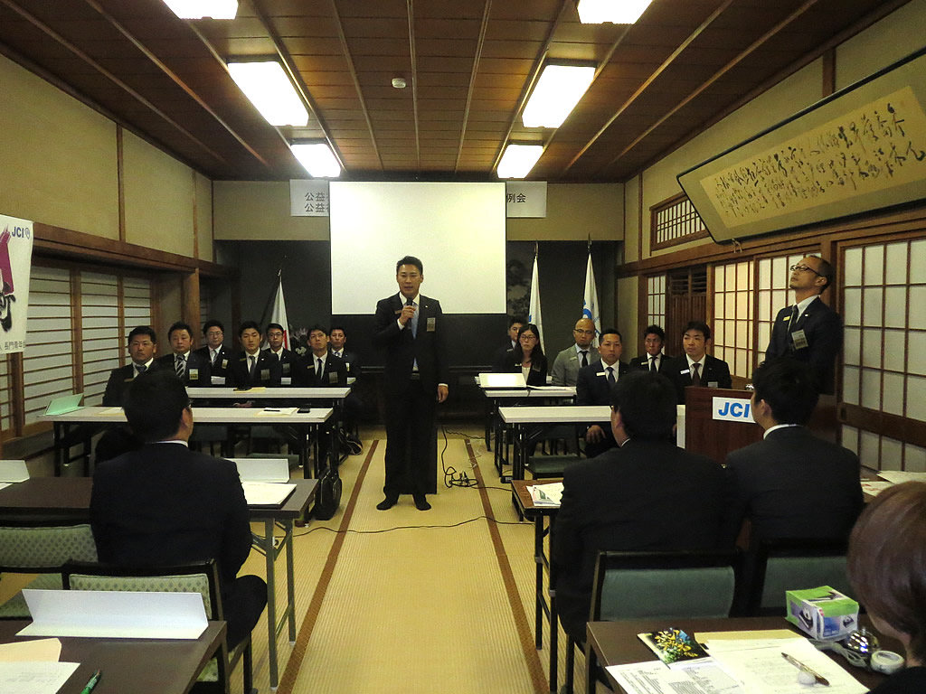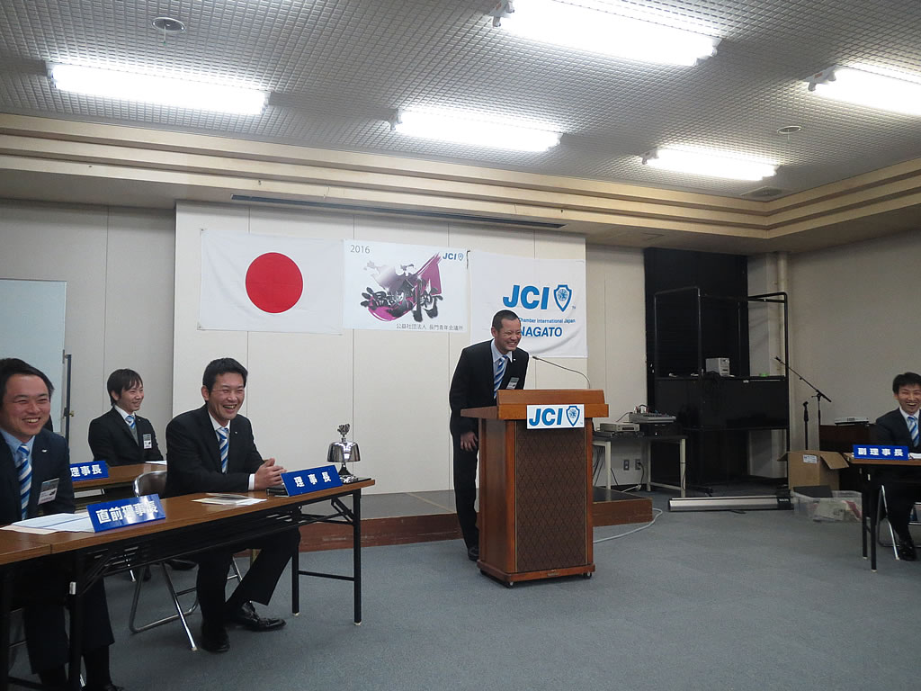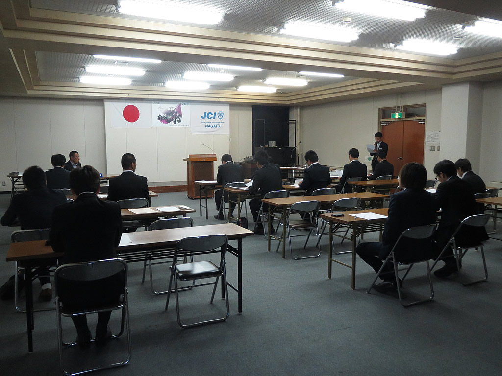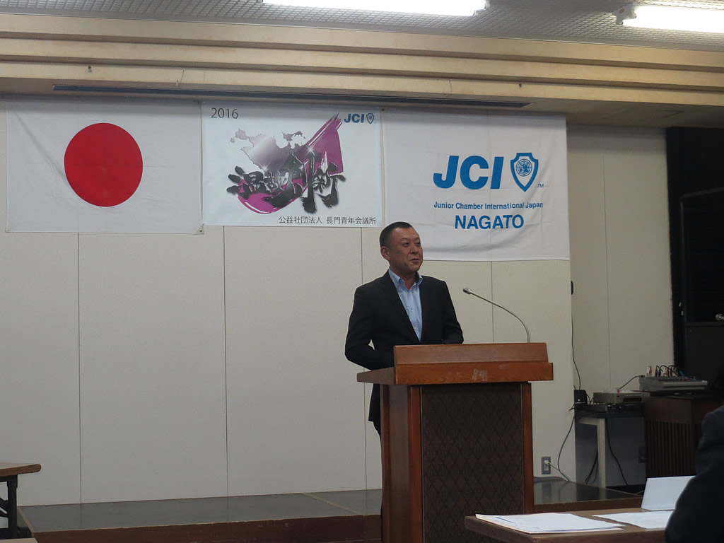 1月10日(日)、市川理事長率いる2016年度体制の初披露の場として、第52回定時総会・懇親会が大正館にて行われました。定時総会第1部では、2015年度の事業報告、会計報告、前年度理事長・山角充君の退任あいさつ及びプレジデンシャルリースの引き継ぎが行われました。第2部からは今年度の事業計画、事業予算が可決され、市川理事長のスローガン『温故創新』のもとメンバー一丸となって活動していくことを誓いました。懇親会では江島潔参議院議員をはじめ、林芳正参議院議員 令夫人裕子様、大西倉雄市長、笠本俊也県議会議員など多くの来賓の皆様、そしてOB会会長である西田和弘先輩をはじめとする長門青年会議所OB会の皆様などのご協力により、無事盛会に終えることができました。ご協力頂きました会員メンバーや関係者の皆さには深く感謝申し上げます。