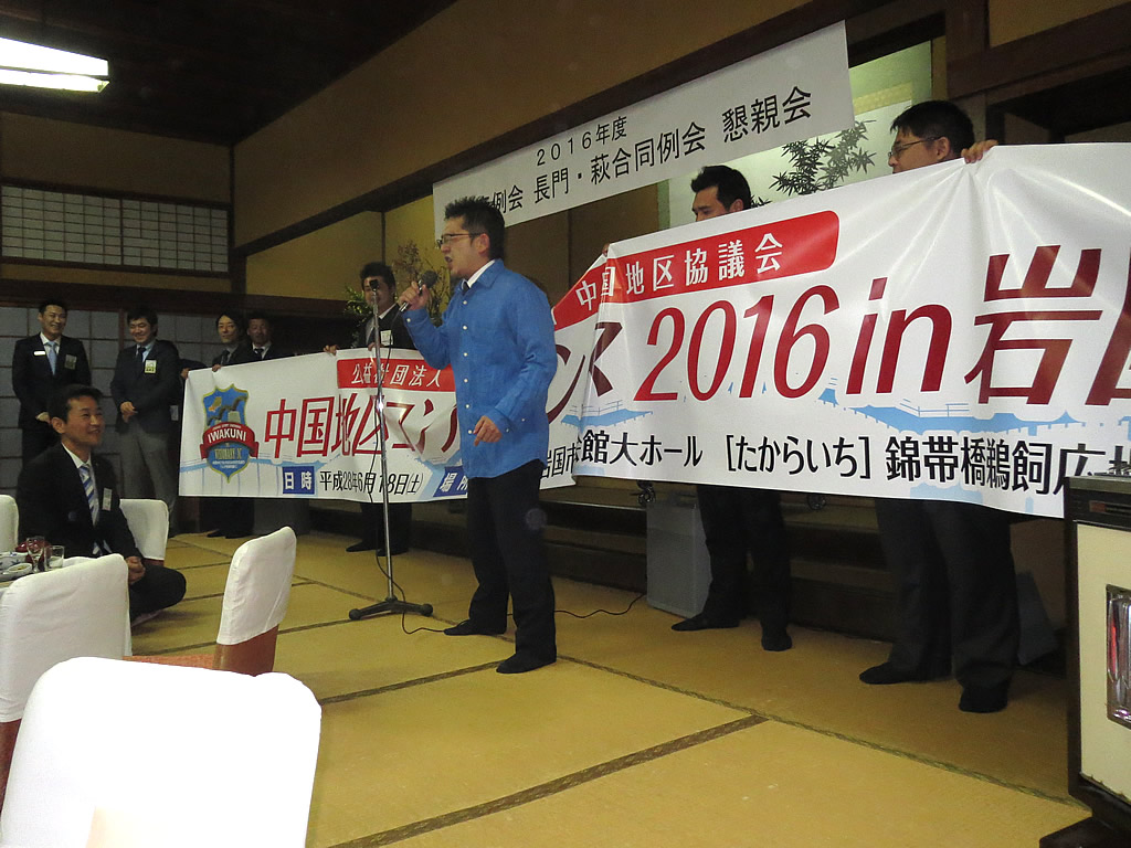 11月1日(火)長門市湯本の山村別館にて「南日本海ネットワーク会議2016」を開催しました。この事業は、山陰道整備早期実現を目的とし、島根県の江津JC、浜田JC、益田JC、山口県からは萩JC、長門JCが参加する会議となっております。オープニングでは長門市の紹介映像を流し、また懇親会では長門市で生まれた「かまぼこ板っ球」や「焼き鳥串打ち大会」などを行い、長門市を存分にアピールできたのではないかと思います。