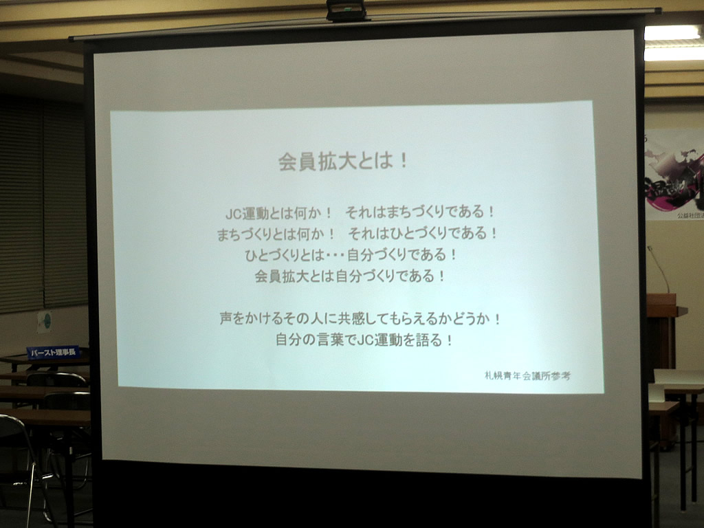4月16日に4月例会を開催致しました。担当例会では新入会員セミナーとして、前半はスライドにてJCの3信条や本年度のJCの事業、JC活動での疑問点について説明しました。後半は4年以上のJC歴の方から、3年以下のJC歴の方へ、JC活動でのこれまでの実体験をふまえ疑問点にお応え頂きました。実体験のまとめとしてJC活動に参加しないことには何も得にくいだろうとのことであり、新入会員をはじめすべての会員が本年度これから本格化する事業へ積極的に参加する方向へベクトルを合わせました。