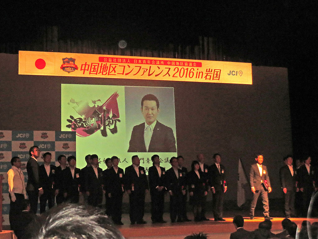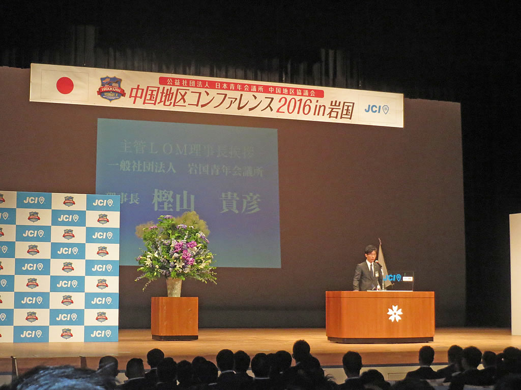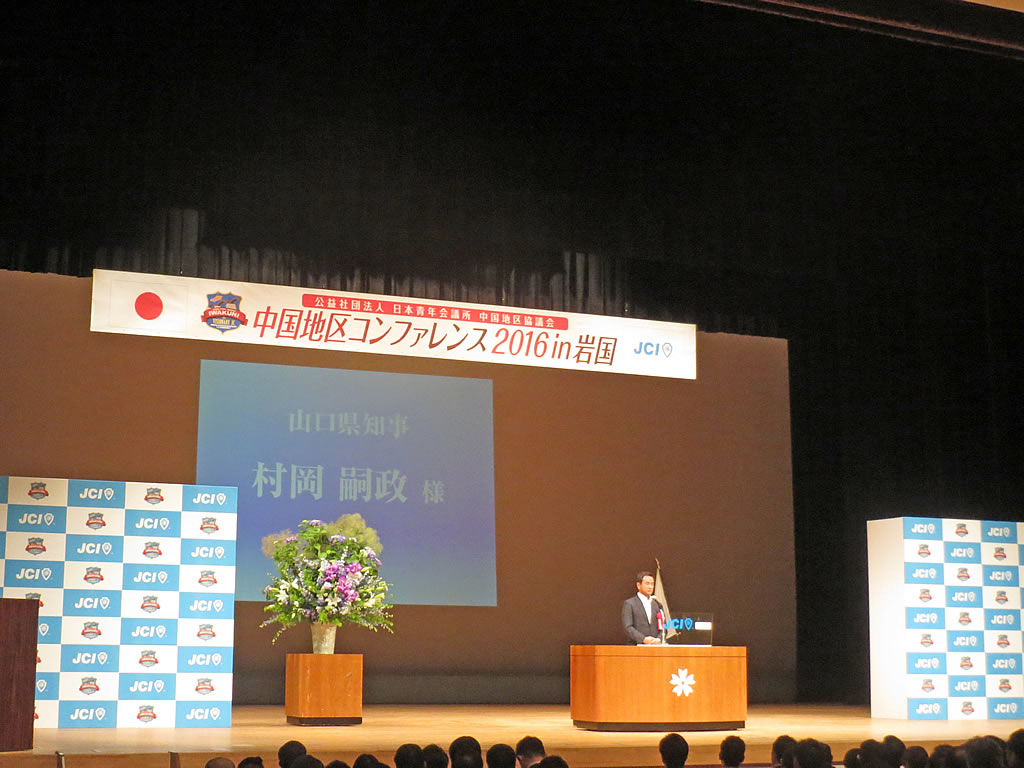 6月18日に岩国市民会館で中国地区コンファレンス2016in岩国が開催されました。中国地区54LOMの会員が集い、多くの来賓の方々も出席されました。午前中に行われた式典はゴスペルから始まり、褒賞の授与や来年の開催地の発表が行われました。また、午後からは竹田恒泰氏をお招きした「フォーラム」や錦帯橋周辺で「たからいち」が開催されました。当日は気温の高かったにもかかわらず、これらのイベントにも多くの参加者が出席しており、大いに賑わっていました。