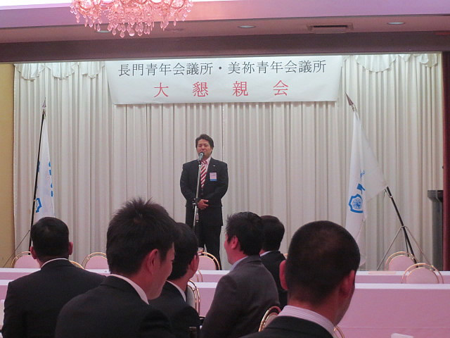 美祢JC・長門JCの合同例会が行われました。この合同例会はお互いの交流を図り、親睦を深めることを目的として毎年開催されています。 親睦会では新入会員として、長門JCからは久永信也君と金子杏梨君が紹介されました。また親睦会でのミニゲームとして、美祢JC対長門JC対抗での腕相撲大会もあり、多いに楽しむことが出来ました。
