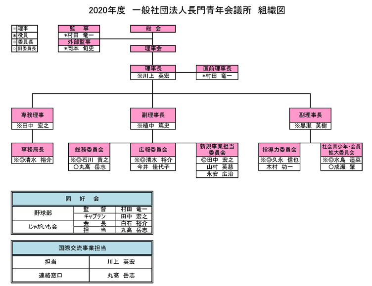 総務委員会 石川 貴之 (株式会社 三隅自動車商会) 我々、長門青年会議所は昨年55周年の節目を迎えましたが、その間様々な活動を展開してまいりました。その全てにおいては、会員のみで成り立つものではありません。地域の皆様や行政・企業・OB・他LOMの方々延いては日本、世界と広がっていき様々な人との「繋がり」によって成り立っています。しかし近年ではその「繋がり」が希薄し交流をもつことが少なくなっていることが現状です。会員が減少傾向にある中、今こそ特に「繋がり」は大事にしていかなければなりません。長門青年会議所の総務委員会の活動は、1月、8月の例会及び総会の企画、運営を行います。対内目的は長門青年会議所の年間事業を円滑に行うための意思決定の場を提供すること、対外目的はOBおよび各方面の来賓に対し長門青年会議所の体制・事業を報告する場の設営、その屋台骨を支えるべく管理し、長門青年会議所が的確にかつスムーズに運営されるよう細心の注意をもって活動していかなければなりません。これらの活動は直接大きな結果に繋がるものではないものの、長門青年会議所の全ての事業に影響を与え、総務委員会メンバーの一人ひとりの行動がそれぞれの委員会活動・LOM活動の成否に影響するということを自覚することが大事と考えます。2020年の各委員会の委員が、築き上げる事業をより輝かせると同時に、色々な方と繋がることで長門青年会議所の存在をアピールするためにも、委員会に所属するメンバーと協力し、委員長同士でも密に連絡を取り合いながら横の連携に務めて参ります。最後になりますが、総務委員会の委員長として、長門の街や市民に必要とされる組織の要になれるよう、また自分自身が成長できるように取り組んで参りたいと思います。