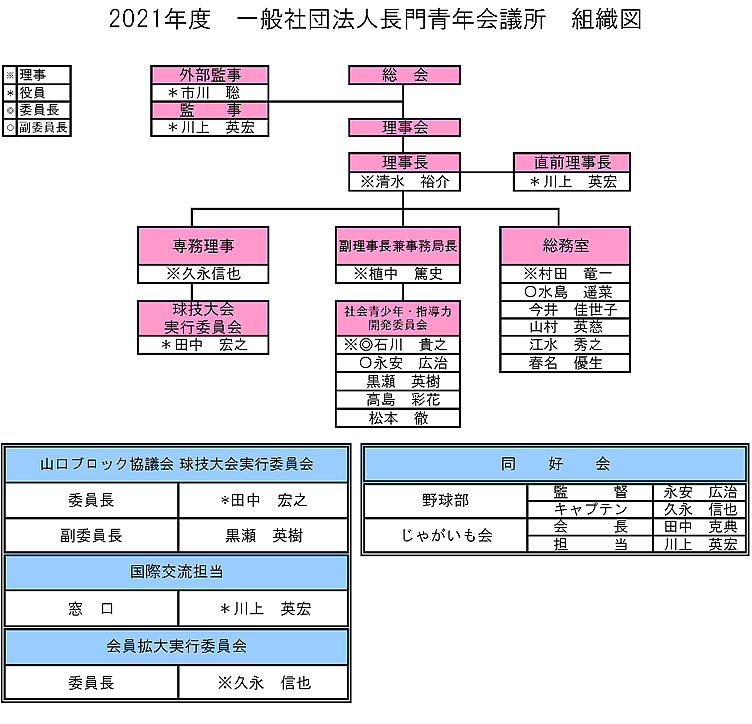 総務室 室長 村田 竜一 (村田商店) 長門青年会議所は、創立57年目を迎え諸先輩方の長い歴史や活動と共に「明るい豊かな社会の実現」に向け行動され、発展してまいりました。会員一同目標に向かい地域の発展や運動など、日々活動に努めております。地域社会で貢献していくには、自分達の資質向上や組織として連帯感などが必要不可欠です。地域に周知されなくては、我々の活動は意味のないものとなります。行政と市民が連携し、まちづくりに関わるすべての為に、信頼される団体に成長しなければなりません。まず総務室が委員会として各自やるべき事への自覚を持ち委員会での連携体制を構築しつつ1月・8月総会の企画・決議を実施し有意義な時間とします。円滑な諸会議の設営・運営を遂行いたします。広報活動では長門青年会議所の事業活動を、WebやSNSツールを十分に活用し活動目的や事業内容を分かりやすく地域市民の皆様にお伝えします。そして12月褒賞事業においては、会員の意識高揚に繋がるよう努めてまいります。我々組織としても会員減少という根源的な問題を抱える中、会員拡大並びに会員育成にも向き合い各個人が危機感を持ち団結しなくては、組織消滅に向かいます。もう一度自分達で組織を見直し、環境作りに取り組み、体制のサポートや拡大をリスト化した情報を全員で共有します。活力ある組織とし、今後も継続し有益な成果につながる基盤となるよう情報発信に取り組んでまいります。最後に、長門青年会議所がこれまで以上に地域社会にとってなくてはならない団体を目指します。2020年から猛威ふるっているコロナウイルスにより生活環境が一変しました。地域経済に影響し、生活の先行きが見えない中、市民の暮らしにも疲弊感が漂っています。早い回復を祈りつつ、地域に少しでも希望や笑顔を提供できる事を心掛け、皆が一丸となり堅実な運営を通じ、強い総務室を突き進んでまいります。