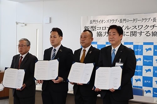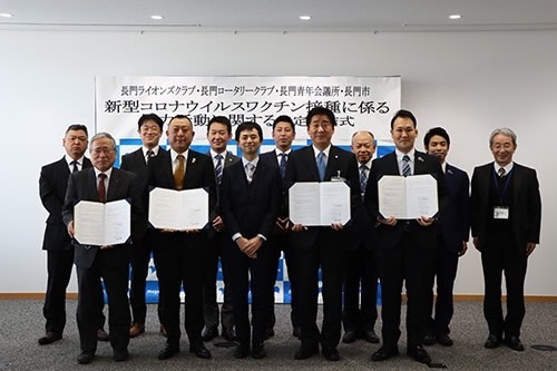 2月16日、長門市、長門ライオンズクラブ 長門ロータリークラブ、一般社団法人長門青年会議所で『新型コロナワクチンに係る協力活動に関する協定』を結びました。長門市でのワクチン接種がスムーズに行えるよう共有し務めます。