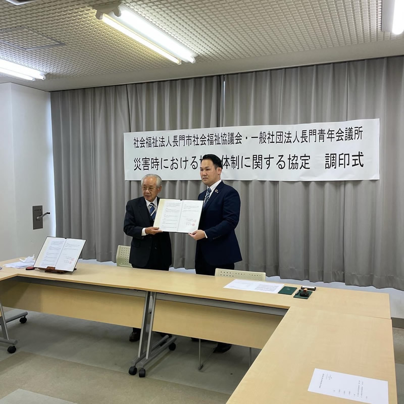5月17日10時より長門市社会社会福祉協議会様と、一般社団法人長門青年会議所が、「災害時における協力体制に関する協定」を締結しました。有事の際に速やかに支援に移れるよう、今後も連絡会等で協議してまいります。コロナ禍でじ自体体を越えての移動が難しいなか地域の事を地域で解決してゆける仕組みづくりが求められます。
