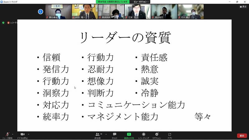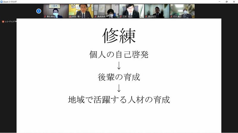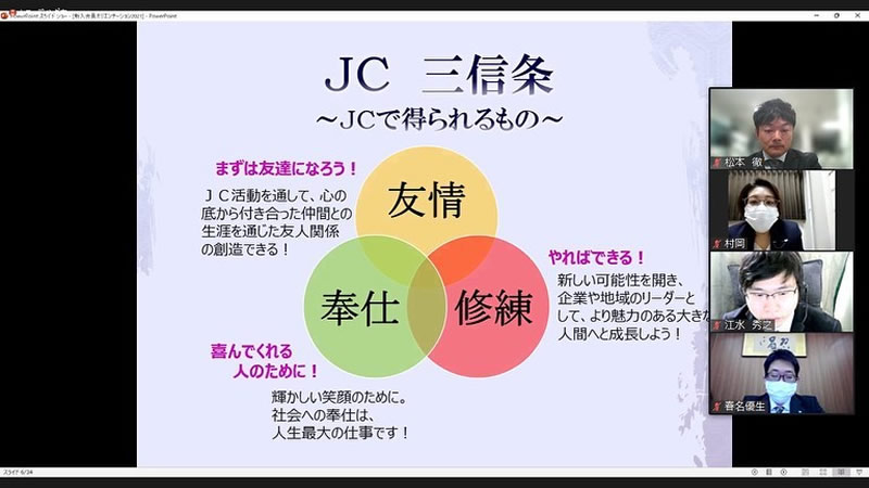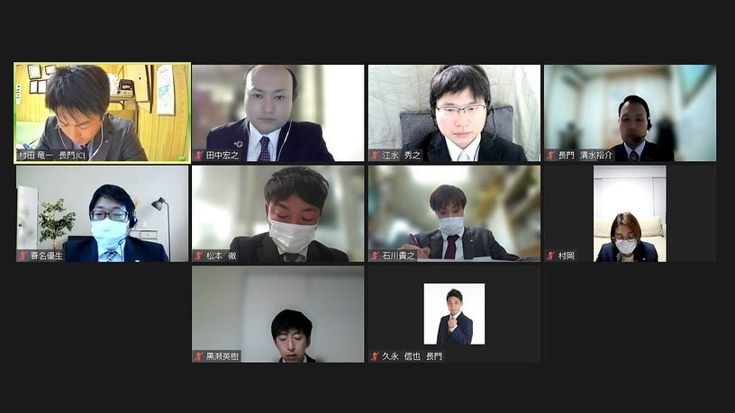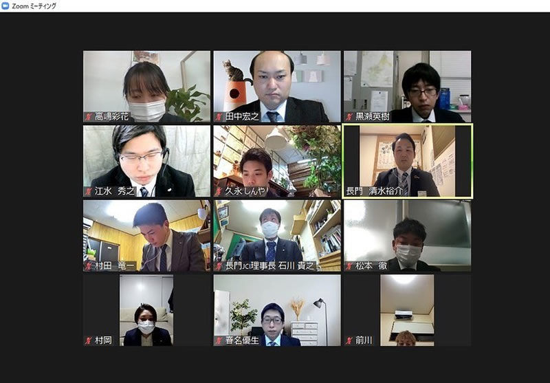 3月16日(水)オンラインにて3月例会を実施しました。担当例会では、当会議所の活動、運動の価値や認識を高めるために新入会員セミナーを行い、「JCで学びたいこと、理想の自分」をテーマにグループディスカッションを行いました。また、理事長をはじめ、多くの役職をご経験された長門青年会議所OB 岡本旬史先輩をお招きし、会員としてあるべき姿、JC活動を通して得られるものなど、貴重なお話を分かりやすくご講演いただきました。改めてJCという立ち位置から学び、行動に移さなければいけないという意識を持つことができ、会員一人ひとりの意識が向上する場となりました。