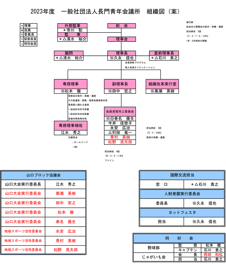 会員資質向上委員会 委員長 春名 優生 (株式会社 チルドエクスプレス) 一般社団法人長門青年会議所は、長門市の人口の減少や高齢化社会と比例する形で会員の減少が進んでおります。会員拡大は必須項目ではあるが、会員拡大も魅力ある団体でなければ拡大につながっていきません。そこで会員の資質向上を目的として、会員それぞれの力を発揮し、魅力ある人であり、魅力ある団体とするために会員資質向上委員会を設立しました。会員資質向上委員会は2023年度、一般社団法人長門青年会議所のスローガン「初芯」をもとに、心新たに会員の資質向上に向けて活動してまいります。様々な事を見つめ直し、時には立ち止まり、時には振り返ることも必要です。普段行動していること、一つひとつに意味があります。意味を知らないまま行動をしても必要なことなのかどうかも判断できません。何事でも意味を考え、理解し、行動することで、より良い環境が創られていくのではと考えます。そういった意味でも「初芯」に相応しい委員会にしていくためにも、自らが率先して行動してまいります。今年度は過去の事業を振り返りながらも、失敗を恐れずに新しい試みに挑戦する必要があります。新たに策定する「長門JCフィロソフィ」の二つの核があり、「未来の長門にワクワクを。明日の自分にドキドキを。」それを体現すべく、ひとづくり、まちづくりに向けた事業や活動を会員全体で考え、積極的に行動をして、一人ひとりが自分自身に挑戦していきます。また個々の成長を家族、友人、会社、自身の周りへ貢献し、還元していける人となり、長門市の未来を切り拓いて、明るい豊かな社会の実現に向けて、全力で活動していく所存です。